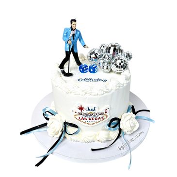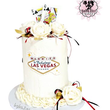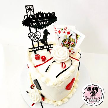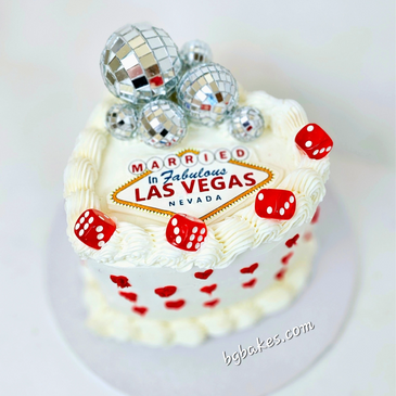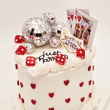 Includes: Disco balls, dice of choice color, marshmellow hearts surrounding cake in choice of color, edible glitter, and an edible Married in Vegas sign.