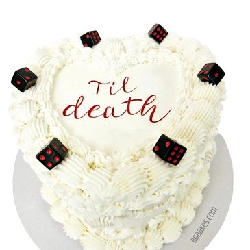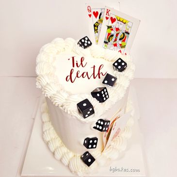 Say “‘Til Death” in true Sin City style. Our Til Death cake is a heart-shaped showpiece designed for wild Vegas weddings, vow renewals, or just lovers who go all in. With bold black script, red dice, King & Queen playing cards, and a classic pink Cadillac, this cake brings the fun, the flair, and the forever.