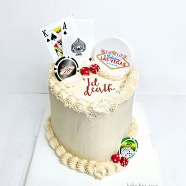 Includes: Playing cards in choice of suit, keepsake Vegas poker chip, lettering cake charm with wording of choice, edible glitter, and dice of choice