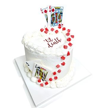 Includes: Playing cards, marshmellow card piece cutout shapes on sides of cake, dice in color of choice, edible glitter, marshmellow fondant roses with ribbon in choice of color. ***TOPPER NOT INCLUDED*** SOLD SEPARATELY FOR $25***