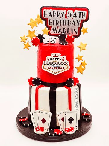 Say "I do" with a little Vegas flair! Our Going to the Chapel cake is a show-stopping single-tier stunner perfect for elopements, chapel ceremonies, and Vegas vow renewals. Decorated with edible playing cards, casino chips, red dice, and the iconic "Married in Fabulous Las Vegas" sign, it’s the ultimate celebration cake for couples tying
