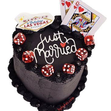 Our Jackpot Hearts cake is a bold, black buttercream stunner featuring edible red dice, pearl piping, a King & Queen of Hearts card topper, and a mini “Married in Fabulous Las Vegas” sign. This heart-shaped design is made for newlyweds, elopers, or anyone who loves a little high-stakes romanc
